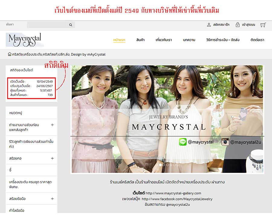 แจ้งลูกค้าทุกท่านค่ะ ขณะนี้ทางร้านได้เปลี่ยนระบบเว็บจากเดิมที่เปิดเว็บมาตั้งแต่ปี 2549 มาเป็นระบบเว็บของบริษัทใหม่ ดังนั้นในเว็บนี้จะปรากฎจำนวนผู้เข้าชมเว็บน้อย รูปต่อจากนี้คือหน้าตาของเว็บเดิมที่เมย์เปิดมาตั้งแต่ปี 2549 มีจำนวนผู้เข้าชมเว็บไซต์ 5 ล้านกว่าค่ะ